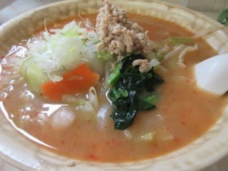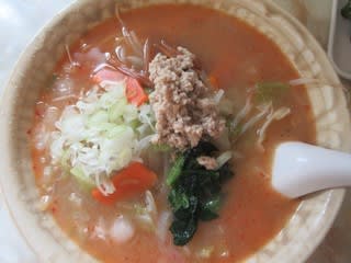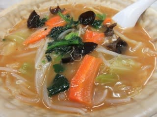 肉、メンマ、キャベツ、にんじん、もやし、玉ねぎなどがのり、スープは結構辛めでコクがあっておいしかったです。