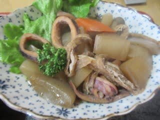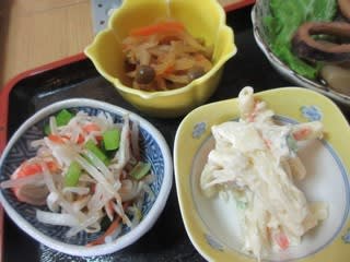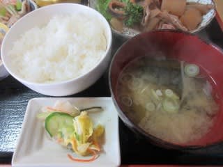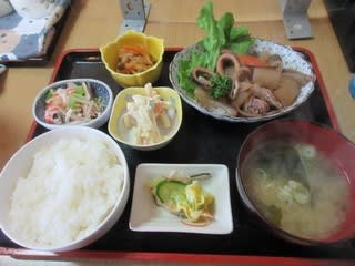 イカ煮は、いかの他に大根、にんじん、油揚げ、こんにゃくも一緒に煮てあるので、野菜にイカの旨みがしみていておいしかったです。小鉢もちゃんと手作りです。もやしとかにかまと小松菜のおひたし、切り干し大根煮、マカロニサラダ、浅漬けで、野菜中心であっさりしているのも良いですね。