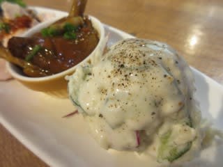 いつものことですが、ティータイムする予定が、昼飲みタイムになっちゃいました。2019年1月に、タパス盛り合わせ5種780円を食べたので、これに該当すると思われるタパス盛り合わせ4種を注文しました。6種類から4種類選べます。オイルサーディン、よだれ鶏、ジャンボなめこのマリネ、ポテトサラダにしました。オイルサーディンは北海道産とのことですが、一般的なものよりかなり大きく、いわしの味付け缶のイワシくらい大きかったです。よだれ鶏は蒸した鶏肉にラー油っほい辛さのタレがかけてあります。芳醇はクラフトビールで、泡はきめ細かくクリーミーで、甘みとコクと苦みのバランスがちょうど良かったです。