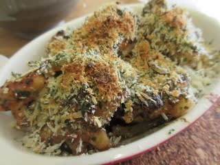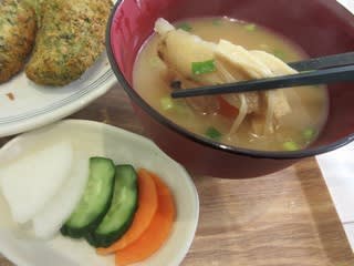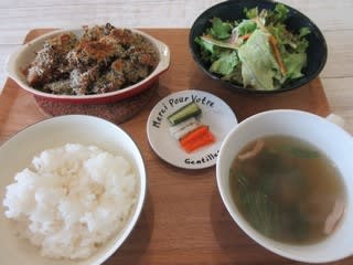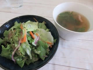 グラタン皿には、ハーブ入りパン粉で覆われた鶏肉と、下には玉ねぎが。風味が良くておいしかったです。こちらは味噌汁ではなくスープ、浅漬けではなくピクルス、サラダ付きです。