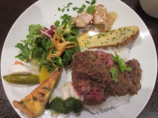4月に、牛ハラミのローストBBQソースを食べてとてもおいしかったので、今回食べれて嬉しい♪しっとりやわらかいな牛ハラミがご飯にのって、シャリアピンソース(玉ねぎのソース)がいっぱいかかけてあります。シャリアピンソースはジュイップさんでは初めてでしたが、コクがあってとてもおいしかったです。タコのバジルソース、三元豚のカツレツ、キッシュ、オムレツ、ピクルス、自家製ドレッシングのサラダと、肉、シーフード、卵、野菜と、バラエティに富んだ盛り合わせで毎回大満足です。