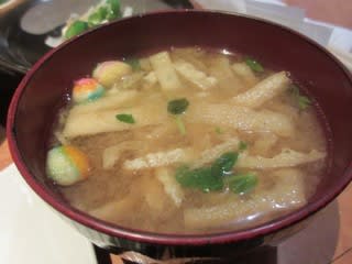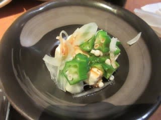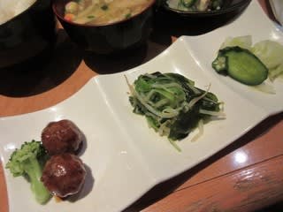 注文を受けるとすぐにご飯と味噌汁が。セルフドリンクコーナーでアイスコーヒーを注いでいるうちに、ホルモン焼きが来ました。やっぱり早い!量が多い!やわらかくて、塩コショウがしっかりめについていておいしかったです。小鉢はミートボール、わかめ・ほうれんそう・もやしのおひたし、浅漬け、おくらのせ冷奴で、野菜や豆腐で栄養バランスにも気遣っていますね。味噌汁には、カラフルな豆麩が入っていて、2016年に食べた味噌汁にも入っていました。
