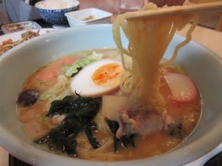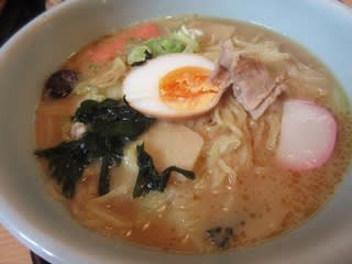 五目焼きそばを注文したら、焼きそばの麺を切らしていて無いとのことで、五目みそラーメンに変更です。五目ラーメンや五目そばなど、メニュー名に五目が付いていると、つい注文しちゃいます。お店によってトッピングが全然違うからです。こちらは豚肉、ゆで卵、かにかま、板かまぼこ、わかめ、メンマ、たけのこなど。スープはニンニクががっちりきいていました。
