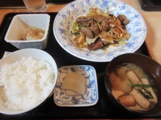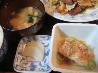 こちらはホルモン炒めよりは量が多く、こってり味噌ベース炒めです。小鉢は冷奴と大根漬けでした。