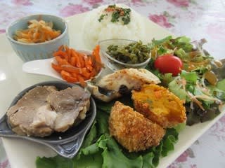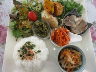 今回は、前回とは違った内容でワクワク!ローストポーク、かぼちゃコロッケ、焼魚(タラ)、いかにんじん、切り干し大根煮、きゅうりの佃煮、サラダなど盛りだくさん。ローストポークは塩味でしっとり。かぼちゃコロッケは、中に入ったにんじんなどの野菜の食感が良かったです。それぞれ手が込んでいておいしかったです。