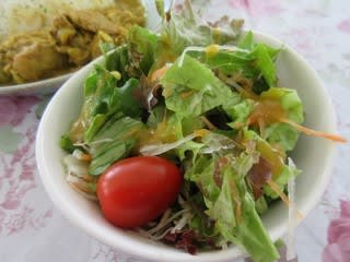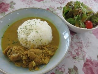 タイ料理のイエローカレーみたいな色ですが、味は違います。マイルドでコクがあり、骨付きの鶏肉が、スプーンで簡単にほぐせるほどやわらかくて、とてもおいしい。サラダも付いてワンコインなんてお安い!