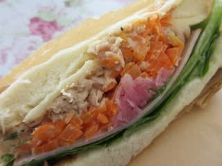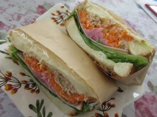 ツナ、ハム、チーズ、トマト、レタス、玉ねぎマリネ、にんじんラぺなど、具だくさんでびっくり。食材の新鮮さを感じるさわやかなおいしさでした。