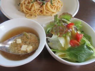 たらこがいっぱいまぶしてあって、イカ、大葉、海苔がのっています。バター風味がしないのが個人的にはgood。あっさり和風でいいですね。サラダと、いつものメカブのスープ(実際はめかぶの味噌汁)が付きます。