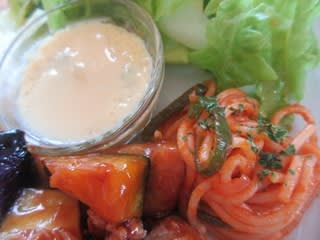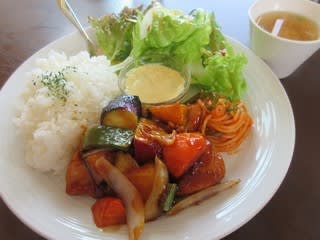 ソラさんはカフェですが、ガッツリ系でしっかりした味のお料理なので気に入っています。鶏唐揚げ、かぼちゃ、なす、玉ねぎなどいろんな野菜を、キリッとした酸味と甘みの黒酢あんで味付けです。酢豚の鶏肉バージョンで、野菜の種類を増やしたみたいな感じです。この他に、茶わん蒸しが付いてきました。ごろっと大きな海老が入っていました。予想外で嬉しい♪