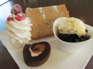 紅茶のシフォン、チョコレート味のロールケーキ、コーヒーゼリーのセットです。運ばれて来た時、ケーキって2種類だっけ?3種類だったような…と思いましたが、注文後、メニューをお返したので手元にメニューがなく、店員さんが忙しそうだったので、メニュー見せてと言いにくかったんです。家に帰ってから、以前撮影したメニューを見たら「ミニケーキ3種+コーヒーゼリー」の記載が。ケーキ1品減らしたの?それともシフォンが大きいから、これで2種類分?やっぱり店員さんに確認すれば良かった。