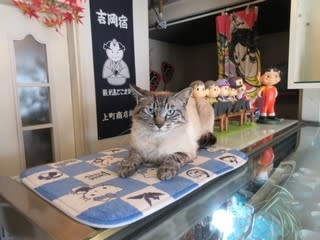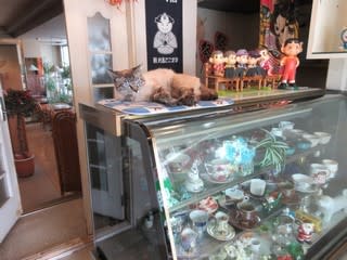 駐車場はお店の建物の裏に2~3台あるのも今回知りました。入口は正面と駐車場側の2か所があり、正面から入ったら、ガラスケースの上に、かわいいネコちゃんが!お店の方に撮影許可をいただき、さっそく撮影。名前を聞いたら「チビシロウ、チビスケ…」と2つくらいニックネームがあるみたい。