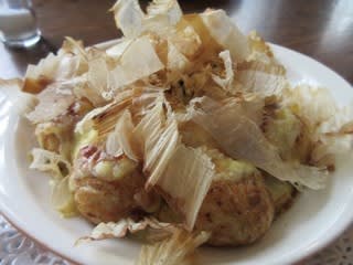 ピザ風なので、トマトソースとチーズを想像していたら違いました。削り節の下には、たっぷりチーズがかかったタコ焼きが10個ほども。タコ焼きの下にはタコ焼きソースは入っているけど、トマトソースは入っていません。ピザ風と言うより、とろけるチーズタコ焼きですね。とてもおいしい!量も多い。