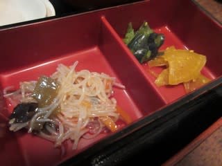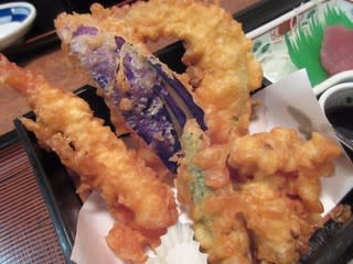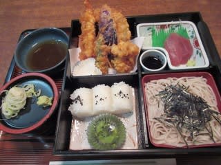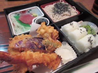 弁当箱にもりそば、天ぷら、刺身、俵型のご飯と漬物が盛り合わせてあります。天ぷらは海老、かぼちゃ、なす、ししとう、まいたけで、衣は厚めについたタイプです。刺身はまぐろ赤身が2切です。そばは普通でした。