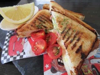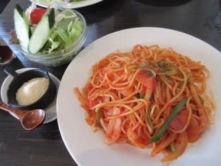 ランチ3種類(日替わり、パスタ、カレー)にはサラダとコーヒーが付き、この他に女性にはプチデザートも付きます。フードメニューはパスタ、焼きそば、焼うどん、カレー類、チャーハン、オムライス、サンド、トーストなど、全部で29種類もある!店名にカフェと付いているけど、フードメニューが充実していて、しっかり食事ができるとはすばらしい!日替わりランチ、パスタランチ、ホットサンドにしました。