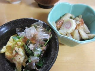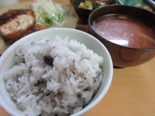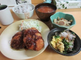 メンチカツは、レンコンのシャキシャキ感がポイントです。小鉢と汁物も手が込んでいます。三つ葉や豆苗など緑の葉物野菜のおひたしに、やわらかい入り玉子の組み合わせが個性的です。なると、ちくわ、糸コンなどのきんぴらはホッとする味。味噌汁はトマト味で切り干し大根入り。トマト味が強めで、和風のトマトスープみたいでした。
