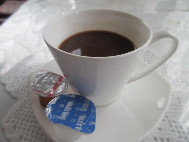 どちらも色が似ていますが、ガムシロとミルク添えのほうがココアで、ミルクだけのほうはコーヒーです。ココアが、コーヒーみたいな濃い色をしているのは、甘みのない純ココアを、牛乳ではなくお湯で溶かしたからのようです。