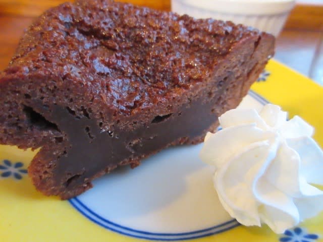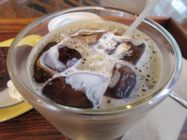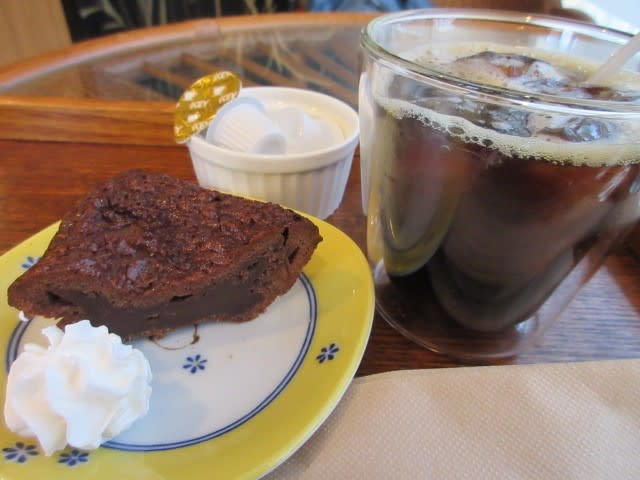 セットのデザートとドリンクがちょうど良いタイミングで来ました。デザートはおまかせで、ショコラ(チョコレートケーキ)です。ドリンクは選べて、アイスコーヒーにしました。ショコラは濃厚でおいしい!