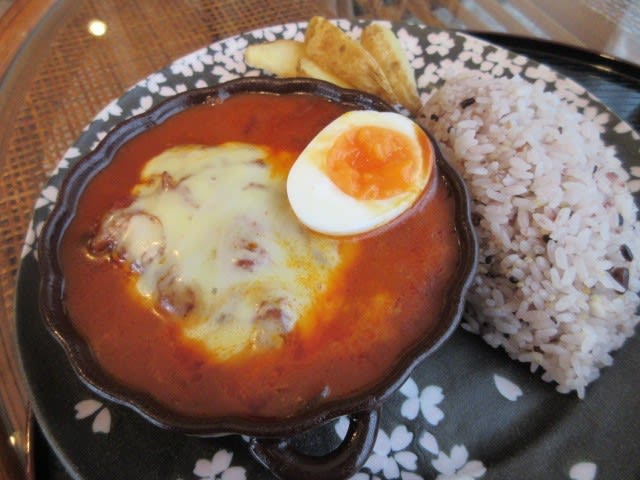 お料理が来るのが早くていいね!ごろんと厚みのあるハンバーグに、デミグラスソースがたっぷりで、チーズがとろ~り。ハンバーグはふっくらやわらかいタイプで、デミグラスソースはトマト風味で、きのこや玉ねぎが入っていました。濃厚で熱々でおいしい!雑穀米、コクのあるオニオンコンソメスープ、新鮮サラダもおいしかったですよ。