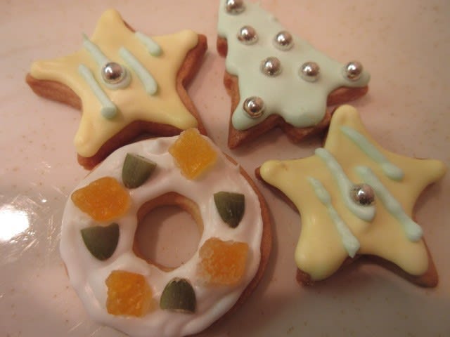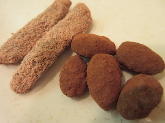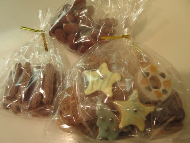 店内の商品棚に、店主さん手作りのクッキー、パウンドケーキ、チョコレート菓子も販売されていて、クリスマスモチーフのクッキーと、デザートでも出た、ショコラ・オランジェを買いました。そしたらサービスで、ショコラ・アマンドをいただきました。ありがとうございます!クッキーは、リース、ツリー、星の形のアイシングクッキーの他、チョコ、オートミール、ナッツなど全部で12枚入っていました。ショコラアマンドは、アーモンドチョコにココアをまぶしたものです。どれも素材の味が濃くておいしかったです。