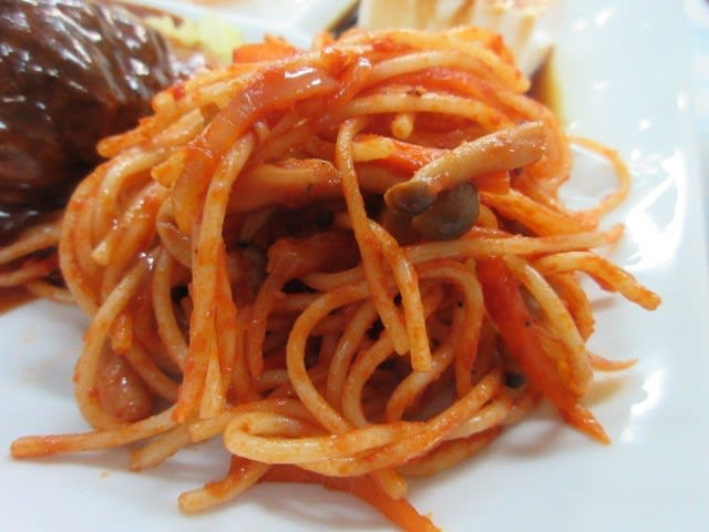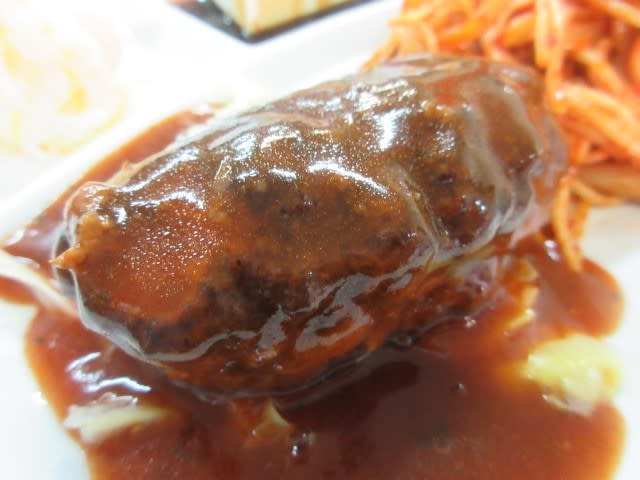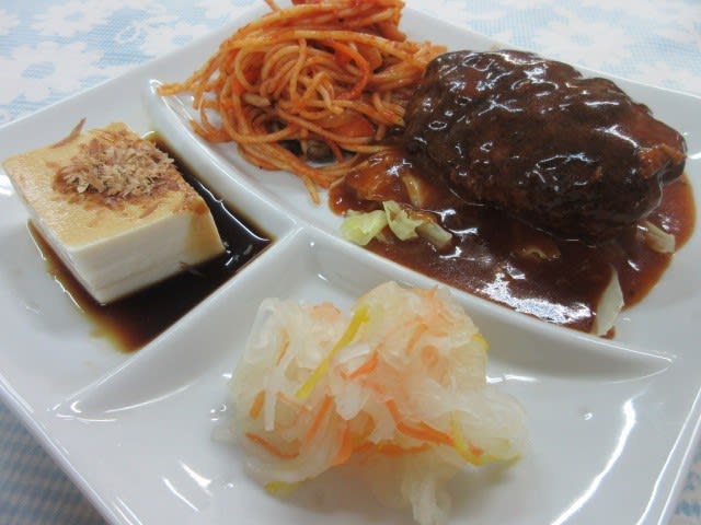 デミグラスソースで煮込まれたハンバーグはちゃんと手作り。厚みがあってふっくらです。ナポリタンも量多め。大根の甘酢漬け、冷奴、鶏がら風味のスープ、ご飯のセットです。甘酢漬けは、柚子の皮の千切りも入っていて、爽やかな風味でおいしいです。スープは鶏がら風味です。