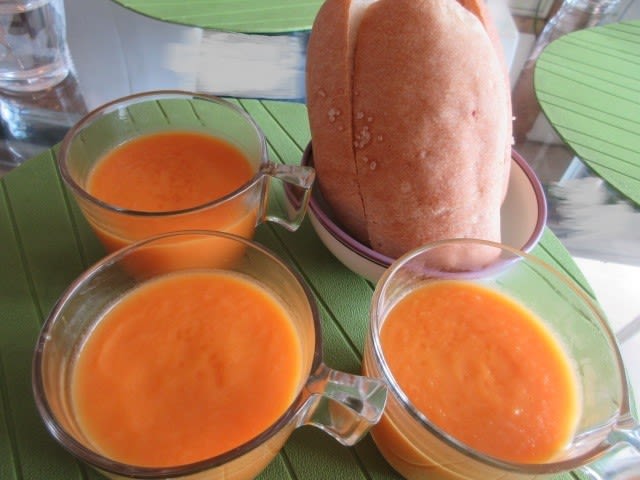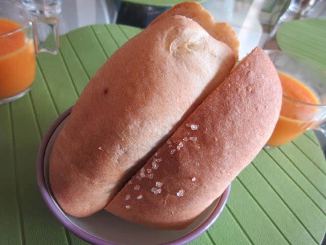 黄金にんじんのポタージュは、甘みがあって、ぽってり濃厚で、しっかりした食感の塩パンと本当によく合います。