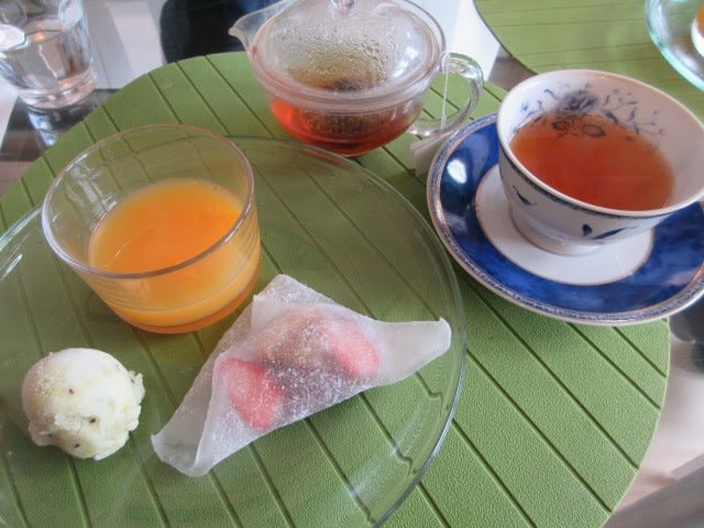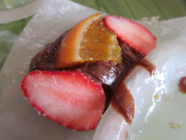 壱弐参さんはデザートも絶品です。今日は、タピオカ餅、オレンジゼリー、キウイジェラード、の3品盛りです。タピオカで作った餅はプルプル食感で、中にはオレンジ、いちご、生チョコ入りでおいしい!オレンジゼリーはオレンジの果肉入りで、キウイのジェラートは水を使わないから、キウイのフレッシュ感が活きていました。