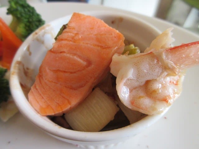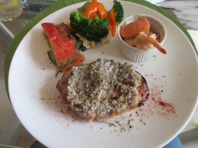 豚リブロースのタプナードソースは、しっかり力のある味わいの豚肉のローストに、しめじ・エリンギ・玉ねぎなどで作ったタプナードソースがたっぷり断面の写真を見て!厚みがあるでしょ。アヒージョは、サーモン、エビ、あさり、角田のねぎを使い、魚介とネギの旨みが濃い。黄金にんじん、アスパラ、いんげんなどいろんな野菜を何層にも重ねたテリーヌは、トマトゼリーで仕上げた一品。フルーツパプリカ、小松菜などの野菜には、野菜がいっぱいのタルタルソースで。