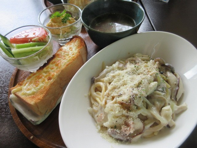 今回も彩り良く美しいセットにテンション上がる!きのこのクリームパスタは、やや太めのスパゲッティに、きのこやベーコンなどがいっぱい入った、クリーミーで旨みのあるソースがたっぷりでおいしい!私は、パスタにパンは必須なので、チーズトースト付きで嬉しい。野菜サラダ、ポテトサラダはフレッシュです。野菜スープはキャベツやにんじんなどが入ったコンソメ味で、パスタにぴったりでした。