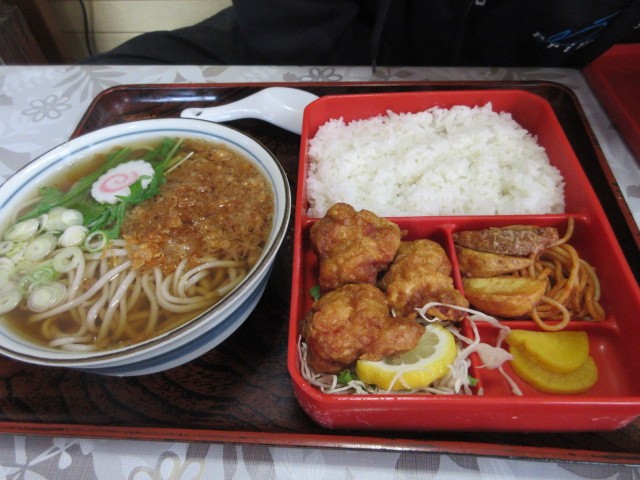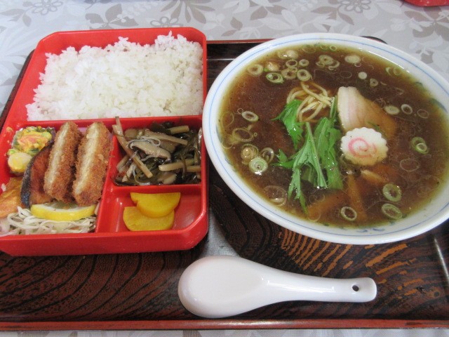 幕の内弁当600円 + 半ラーメン300円、からあげ弁当600円+半はなそば280円