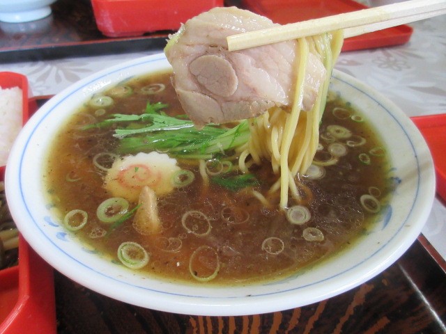 幕の内弁当は、焼き鮭、玉子焼き、チキンカツ、きのこ煮、レーズン入りかぼちゃサラダ、生野菜サラダ、漬物、かまぼこのセットです。昔風の赤いお弁当箱に盛り込まれていて、素朴な感じで大好き。チキンカツ以外は手作りですね。せいろ庵さんのラーメンが大好きだったので今回も頼みましたが、運ばれてきた時から鶏のニオイが。食べてみたけど苦手な味。鶏のニオイが気にならない夫も、今回は気になったとのこと。今回初めてです。