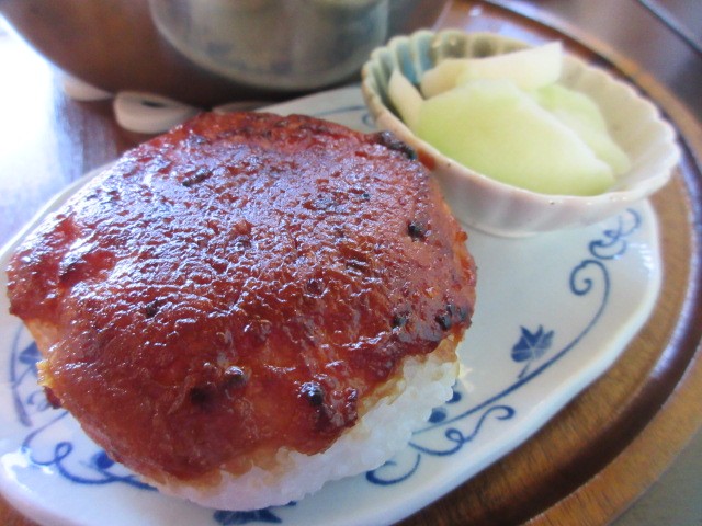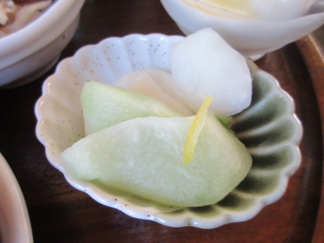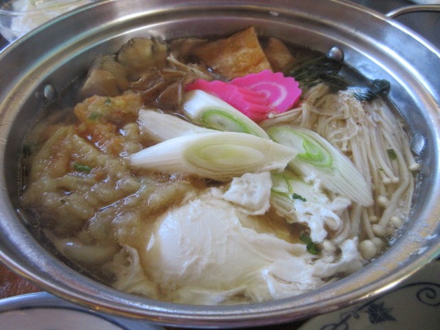 こういう鍋に入ってくると妙にワクワクする~!。かき揚げ、卵、油揚げ、まいたけ、えのき、なると、ねぎなどがのって具沢山。熱々でおいしかったです。味噌おにぎりと、はやとうりの浅漬けも付いて食べ応えがありました。