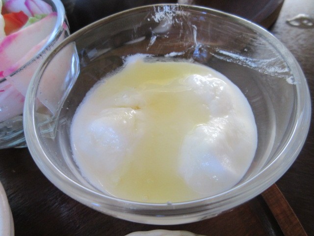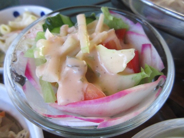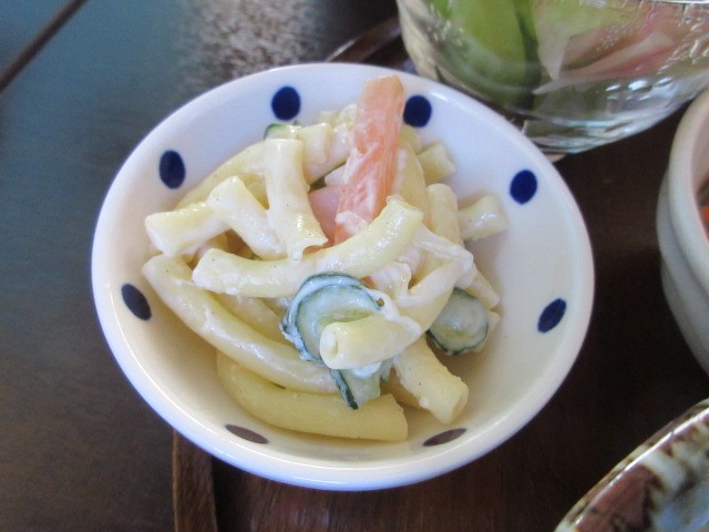 今回は、手作りコロッケです。ひき肉を混ぜ込んだじゃがいもは、ほくほくとした食感で、手作りならではのおいしさです。切干大根煮、ビタミン大根入りのサラダ、マカロニサラダ、はやとうりの浅漬けは柚子風味、きのこ入りのスープは旨味たっぷり。はちみつヨーグルトも付いて盛りだくさんです。食後にはコーヒーまたは紅茶が付きます。